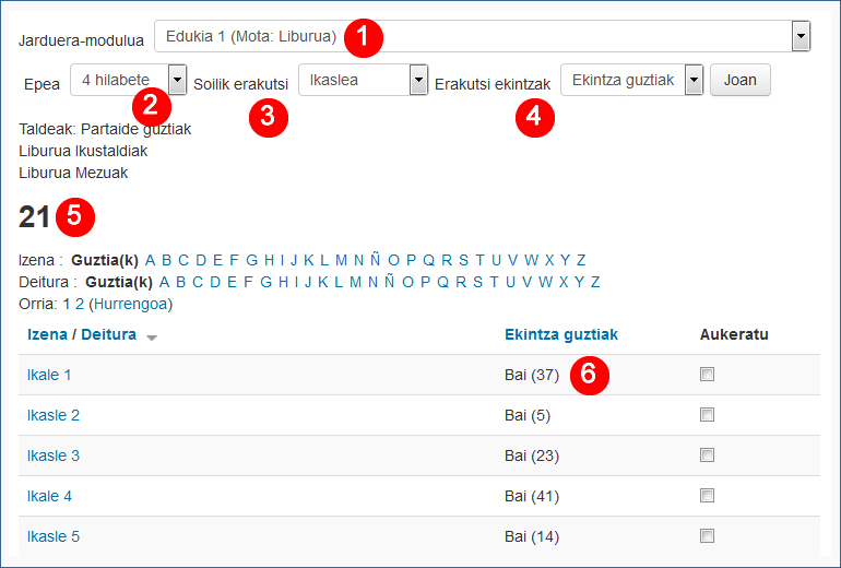 “Ikastaroaren jarduera” aukerak erakusten duen taulak irakasle roldun erabiltzaileak ere azaltzen ditu, goialdeko irudian gorriz adierazten den bezala. Kasu honetan, ikasleek eskuragarri ez duten dokumentu bat izango litzateke beraz, islatzen diren agerraldi irakasle roldun erabiltzaileenak izango lirateke. Gainontzeko kasuak erabiltzailearen rolaren arabera bereiztean ezinezkoa da.
