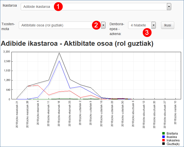 Estatistikak eGelaPIn daude soilik eskuragarri, izan ere, erabiltzaile kopuru handia dagoen plataformetan (eGela) errendimendua kaltetzea eragin baitezake. Grafiko batean jarduera aktibitate tamaina astekako tarteetan azaltzen da (agerraldi kopuru gordina). Ondorengo irudian azaltzen den bezala, 1) zein ikastarotan kontsulta egin nahi den, 2) txostenean azalduko diren erabiltzaileen rola eta 3) kontsulta egingo den denbora tartea aukera daitezke.