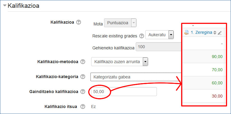 Jarduera bat gainditu den edo ez jakiteko, gainditzeko gutxieneko kalifikazioa zehaztea beharrezkoa da. Horretarako, jardueraren ezarpenaren baitan, kalifikazioa atalera jo beharko da. Ondorengo irudian, zeregin baten "ezarpenetan" zabaltzen den formularioa agertzen da.