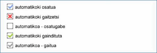 Irakasleak jardueraren osaketarako irizpideak zehazten dituenean ikasleak jarduera horri lotutako karratutxoak irizpide horiek bete dituen edo ez erakusten du. Irakasleak kasu guztietarako, aldiz, irudian azaltzen den azkena ikusiko du (automatikoki-gaitua) zeinak jarduera nola konfiguratu duen adierazten dion.