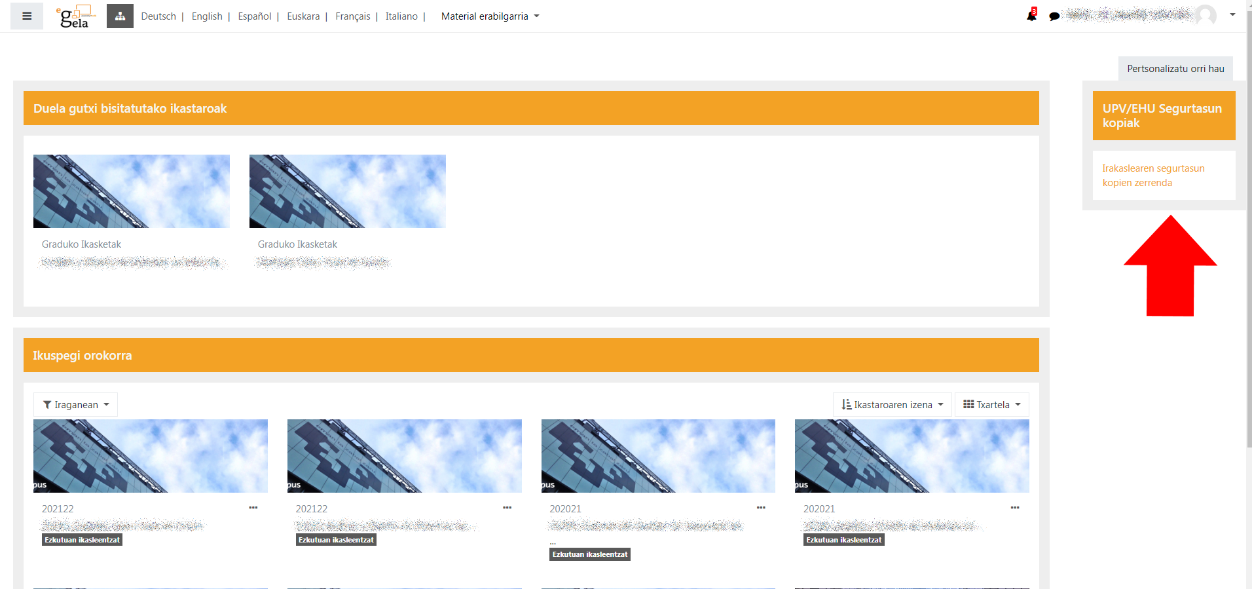 Une horretan dagoen ikastarorik zaharrenaren segurtasun-kopia gorde nahi duenak ekainaren 17a baino lehen deskargatu ahal izango du, eGelako babeskopien blokearen bidez, "NOLA DESKARGATU KOPIAK EZABATU BAINO LEHEN?" atalean azaltzen den bezala.