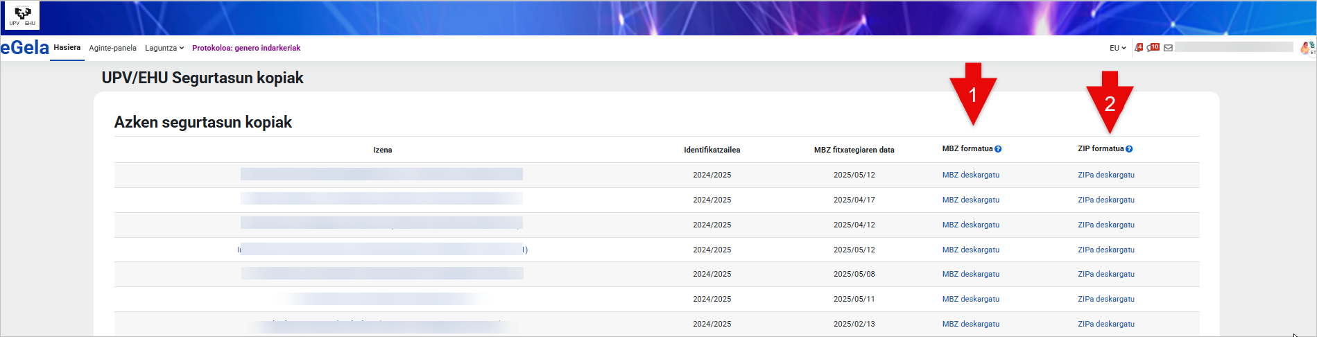 - MBZ formatua berehala deskarga daiteke. Formatu honek ikastaroaren kopia zehatza eta osoa du, eta ikastaroa bere eduki guztiekin eGelan berrezartzeko aukera ematen du. MBZ formatuko fitxategiak ikastaroan matrikulatutako pertsonen datuak ditu, beraz, ikaslearen datu pertsonalak dituen beste edozein fitxategi bezala zaindu eta babestu beharko da. MBZ formatuak ez du ikastaroko edukietara zuzenean sartzeko aukerarik ematen, aldez aurretik berrezarri gabe.