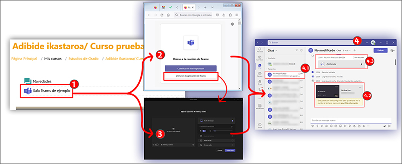 eGelako (1) gela birtual batetik sortutako Teamseko “bilera-gela” batera sartzean, nabigatzailearen fitxa berri batean irekitzen da (2). Bi aukera daude: nabigatzaile berarekin bileran sartzea edo mahaigaineko aplikazioa erabiltzea (3). “Teams” mahaigaineko aplikazioa ekipoan instalatuta ez badago, orrialde honetan bertan deskarga daiteke. Instalazioa baimenduta dago.