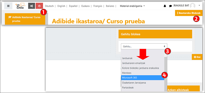 Ikastaroan edizioa aktibatuta dagoela (1), sakatu “Ikastaroko blokeak” (2) blokeen eremua zabaltzeko. “Gehitu blokea” (3) menuan, aukeratu “Microsoft 365” (4).