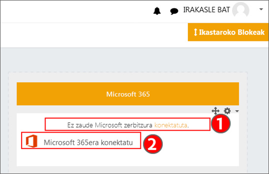 Blokeak konexio-egoera adierazten du, ondorengo irudiaren kasuan ez da oraindik konexioa gauzatu (1). Sakatu “Microsoft 365era konektatu” (2) konexio aukerak eskuragarri izateko.