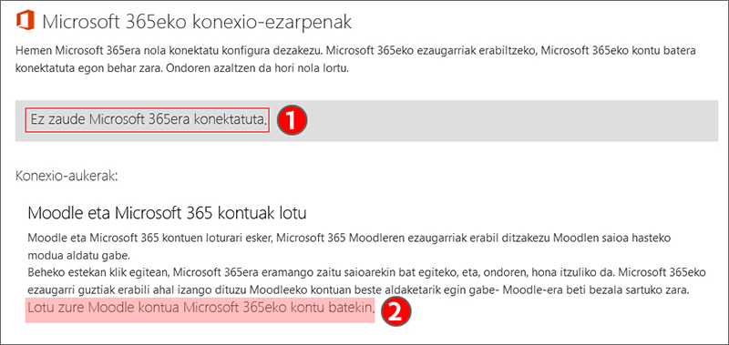Kasu honetan orriak konexiorik ez dela egin (1) adierazten du. Sakatu “Lotu zure Moodle kontua Microsoft 365eko kontu batekin” (2).