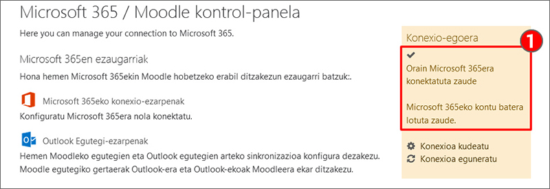 “Microsoft 365/ Moodle kontrol-panela" orrian konexio egoera adierazten da (1). Lotura gauzatzeko, sakatu “Konexioa kudeatu” (2) edo “Microsoft 365eko konexio-ezarpenak” (2).