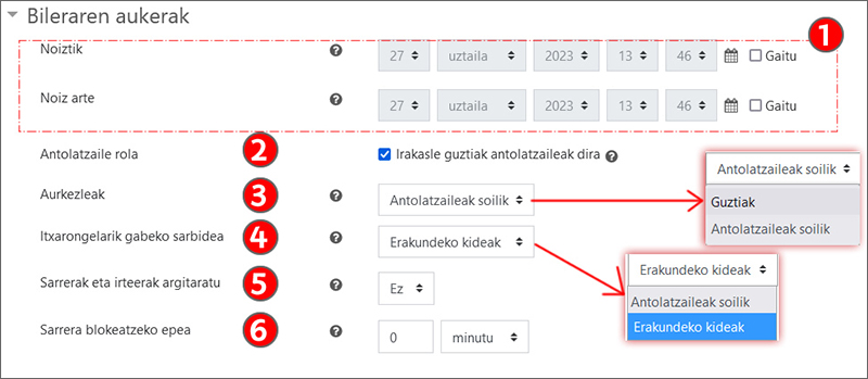 - Sarrera blokeatzeko epea: partaideek “Antolatzailea” bileran sartzen denetik sartzeko duten epea zehazten du. Ezarritako denbora igaro ondoren sartzen direnek ondoko mezu hau aurkituko dute: “Epez kanpo dago bideokonferentziarekin bat egiteko. Mesedez, saia zaitez saioarekin bat egiten hurrengo aldian ezarritako epean.” Hala ere, “Noiztik” eta “Noiz arte” aukeren kasuan bezala, bilerako lotura dutenei blokeo horrek ez die eragiten. Gainera, bileran bertan hala ezartzen bada, ikasleak ezin dira bileran sartu irakasleak bertan ez badaude, nahiz eta “Itxarongelarik gabeko sarrera” eremuan “Erakundeko kideak” markatuta egon.