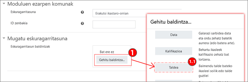 MS-Teams Bideokonferentzia jarduerak eGelako “Moduluen ezarpen komunak” atalean ez du “Talde-modua" eremurik, beraz ezin da taldekako bilerarik sortu. Baina “Mugatu eskuragarritasuna”> Gehitu talde partaide baldintza” bidez gauza daiteke bilera jakin batera talde jakin batek soilik sarbidea izatea. (1.1) Informazio gehiago “Mugatu eskuragarritasuna” “Jardueren jarraipena egiteko tresnak, eskuragarritasuna mugatu eta dominak” eskuliburuan.