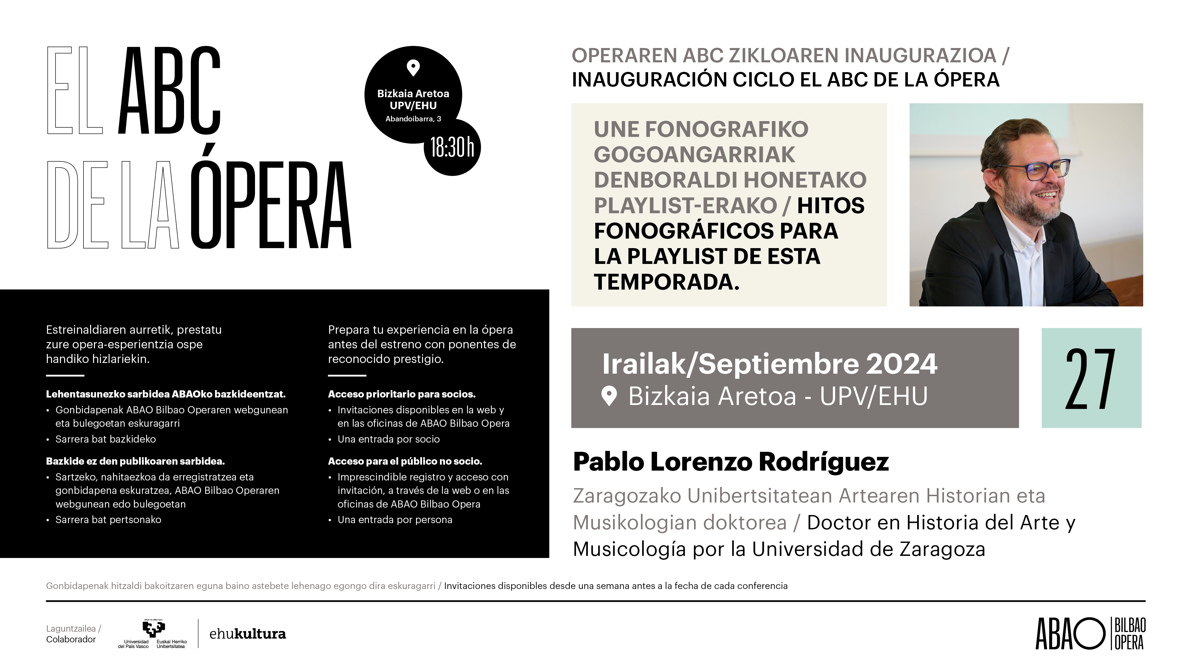 Pablo Lorenzo Rodriguez, Zaragozako Unibertsitatean Artearen Historia eta Musikologian doktorea izango da hizlaria "Operaren ABC zikloaren inaugurazioko hitzaldian.