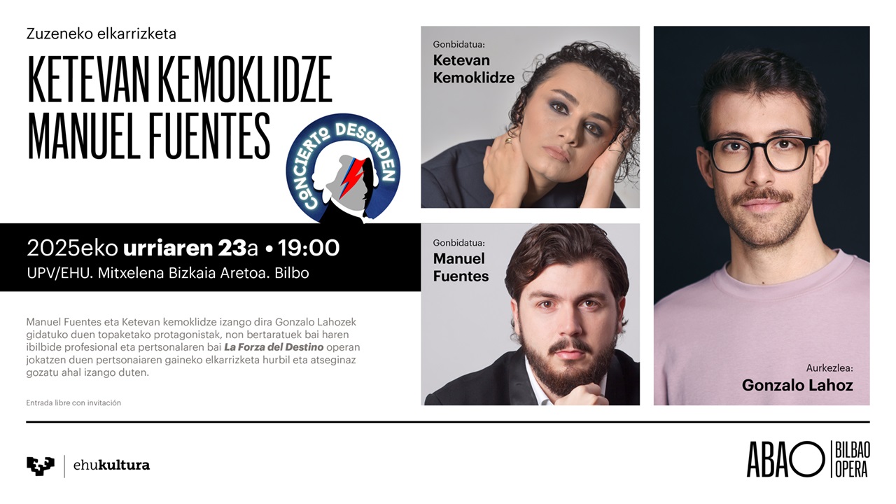 Ketevan Kemoklidze eta Manuel Fuentes izango dira protagonistak Gonzalo Lahoz buru izango duen topaketa honetan. Bertan, “Concierto Desorden” podcast dibertigarriaren kapitulu berri bat grabatuko da zuzenean, haien ibilbide profesional eta pertsonalaren inguruan, baita “La forza del destino” operan izan zuen paperaren inguruan ere.