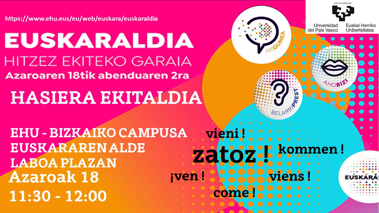 EUSKARALDIA. Hasiera ekitaldia Noiz eta non 2022/11/18, 11:30 Facebook bidez partekatu - (Beste leiho bat zabalduko du) Bluesky bidez partekatu - (Beste leiho bat zabalduko du) Linkedin bidez partekatu - (Beste leiho bat zabalduko du) Whatsapp bidez partekatu - (Beste leiho bat zabalduko du) Telegram bidez partekatu - (Beste leiho bat zabalduko du) Bidali mezu elektroniko bidez - (Beste leiho bat zabalduko du) Esteka kopiatu - (Beste leiho bat zabalduko du) Deskribapena .