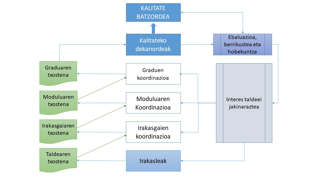 Titulazioaren jarraipena koordinatzaileak (ataleko batzordeak edo/eta ataletako batzarrek izendatuak) bermatzen du, bai eta mailako eta moduluetakoek ere. Koordinazio lana horizontala (irakasgaiak eta moduluak) eta bertikala (moduluak eta graduak) da, ondorengo fluxugraman ikus daitekeenez: