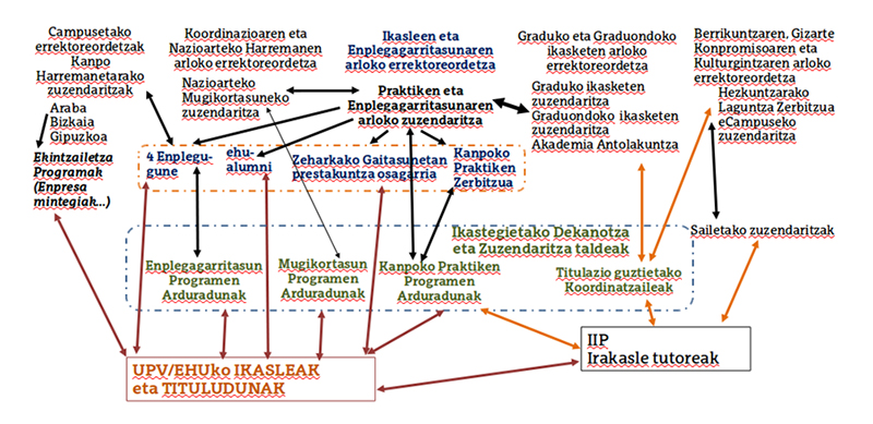 Hori guztia egiten da koordinazioan, Praktiken eta Enplegagarrita-sunaren arloko Zuzendaritzaren (Ikasleen eta Enplegagarritasunaren arloko Errektoreordetza) eta beste errektoreordetzetako zuzendaritzen artekoa. Zehazki, honako hauekin koordinatuta: