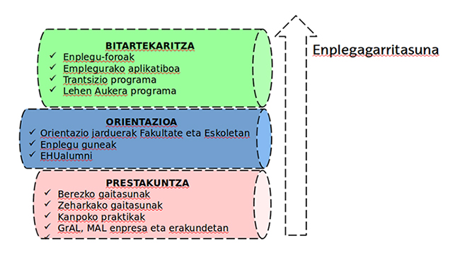 UPV/EHUk, Enplegagarritasun Plana diseinatu aurretik ere, lan handia egin du ikasleen eta tituludunen enplegagarritasunaren alorrean, aukera handiagoak izan ditzaten beren etorkizun profesionalari ekiteko.Lan hori koordinazioan egiten da UPV/EHUko eragile eta zerbitzuekin (1. Irudia).