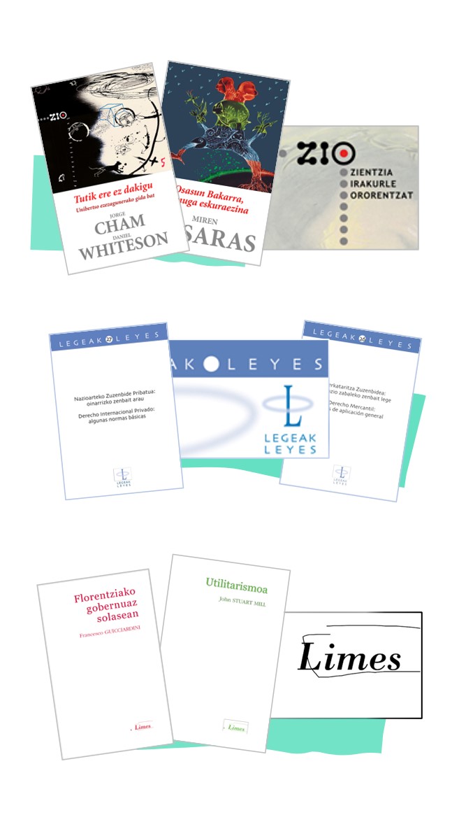 Euskarazko hiruna aldizkari (Ekaia, Gogoa eta Tantak) eta liburu-bilduma (ZIO, Legeak-Leyes eta LIMES) sustatzen ditugu, bai diruz lagunduz eta bai testuen hizkuntza-maila berrikusiz eta zainduz ere.