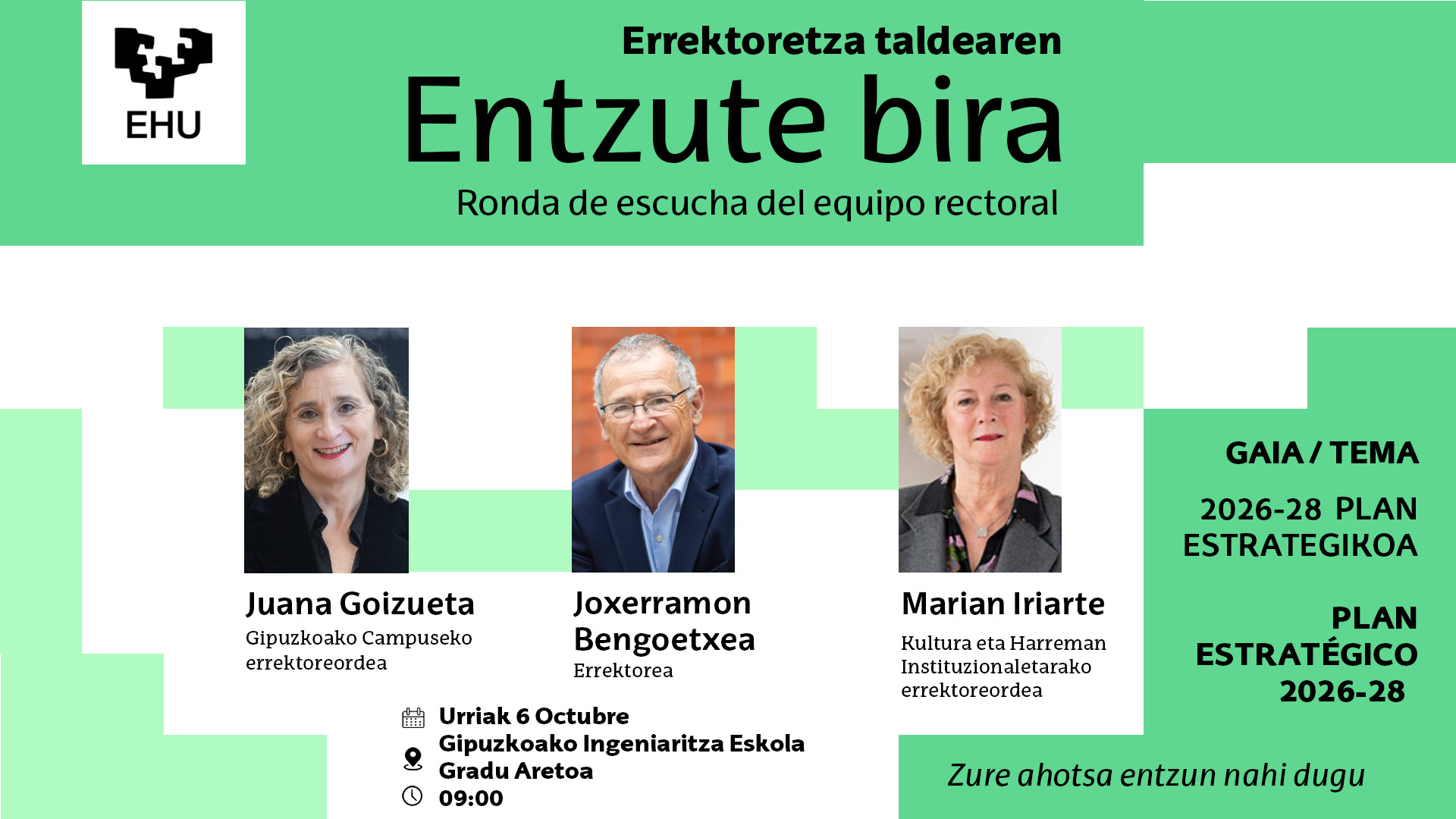 Datorren astelehenean, goizeko 9:00etan Gradu Aretoan (Donostian) ENTZUTE-BIRAren barruan errektoretza taldea bisitatuko gaitu. 2026-2028 Plan Estrategikoa diseinatzeko prozesuan daude eta denon iritziak garrantzitsuak dira.