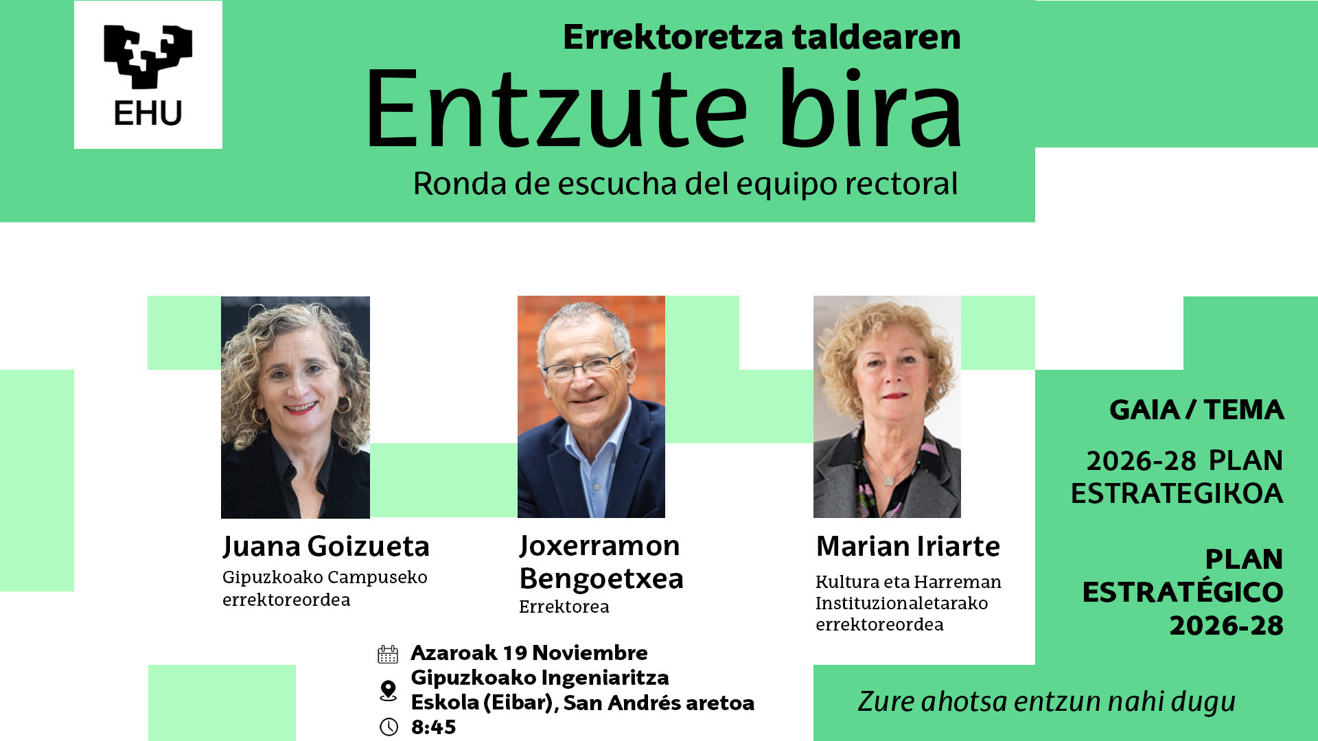 Azaroaren 19an, asteazkena, 8:45ean, Eibarko San Andres aretoan, errektoretza taldeak bisitatuko gaitu ENTZUTE-BIRAren barruan. 2026-2028 Plan Estrategikoa diseinatzeko prozesuan daude eta denon iritziak garrantzitsuak dira.