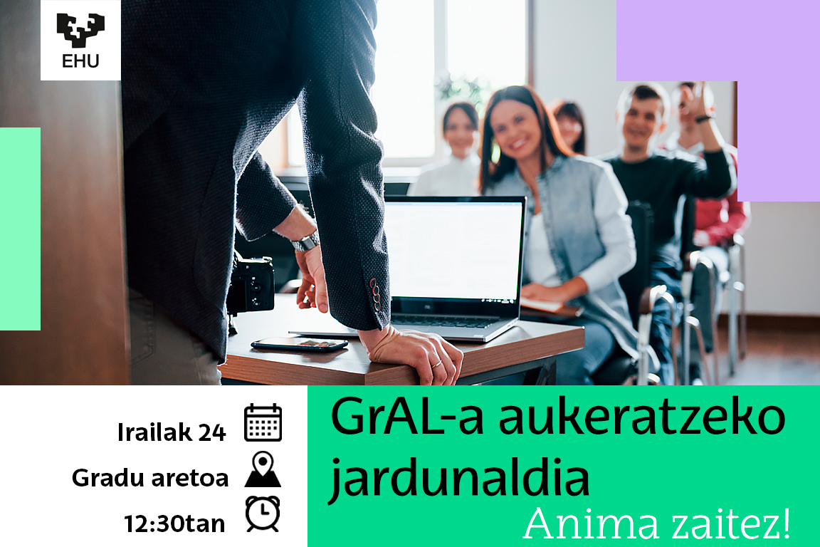 GrALa aukeratzeko fasean dauden ikasleentzat jardunaldia, irailaren 24an, 12:30tan Gradu Aretoan. Jardunaldi honetan aukera izango duzue: