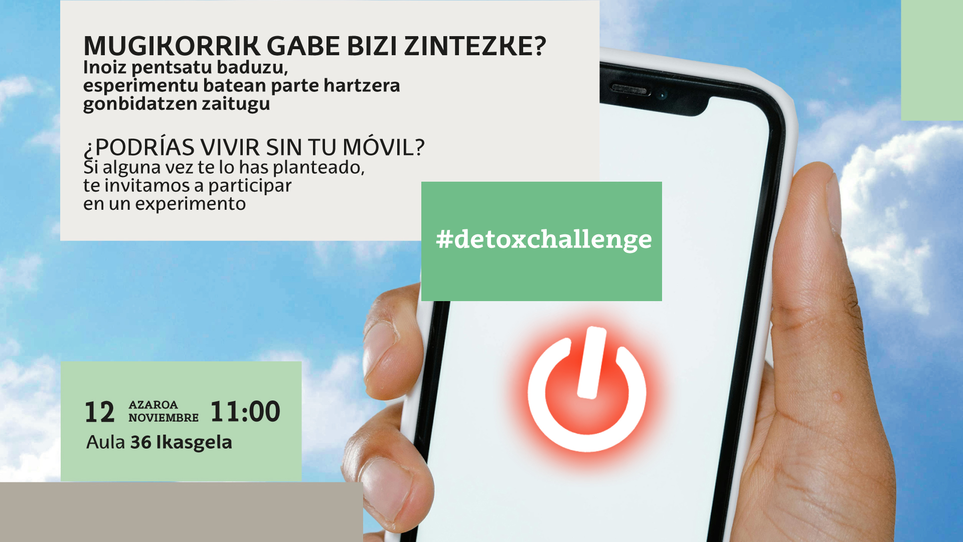 #detoxchallenge. Mugikorrik gabe bizi zintezke? Data 2025/11/12, 11:00 Facebook bidez partekatu - (Beste leiho bat zabalduko du) Bluesky bidez partekatu - (Beste leiho bat zabalduko du) Linkedin bidez partekatu - (Beste leiho bat zabalduko du) Whatsapp bidez partekatu - (Beste leiho bat zabalduko du) Telegram bidez partekatu - (Beste leiho bat zabalduko du) Bidali mezu elektroniko bidez - (Beste leiho bat zabalduko du) Esteka kopiatu - (Beste leiho bat zabalduko du) Inoiz pentsatu baduzu, esperimentu batean parte hartzera gonbidatzen zaitugu: #detoxchallenge Azaroaren 12an, 36. gelan izango gaituzu zain, 11:00etan