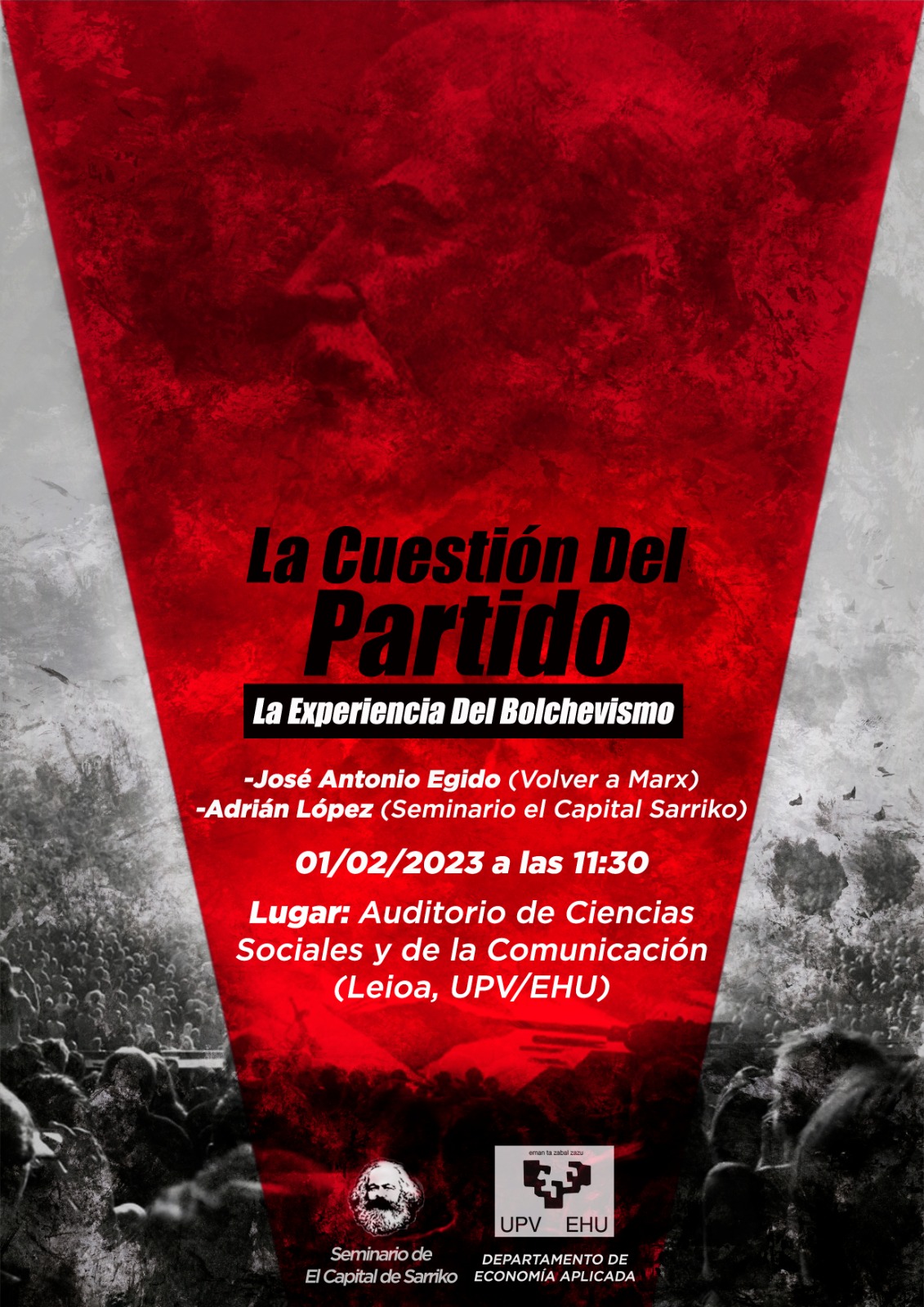 Kaixo! Sarrikoko El Capital Mintegitik antolatu dugun hitzaldian parte hartzera gonbidatu nahi zaitugu. Bertan azken hilabeteetan landu dugun gaian, alderdiaren auzia Lenin eta boltxebismoan, sakontzeko asmoa daukagu. Horretarako Jose Antonio Egido, Volver a Marx elkarteko kidea, gonbidatua izan da. Hitzaldia otsailaren 1ean 11:30tan gure fakultatean ospatuko da, Gizarte eta Komunikazio Zientzietako Auditoriumean, hain zuzen ere.