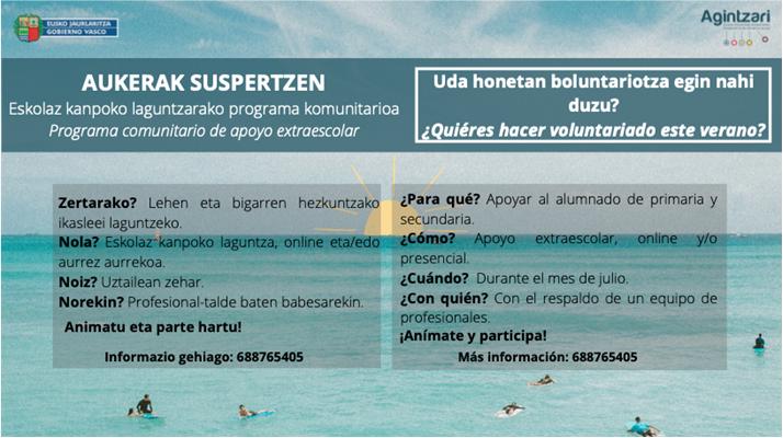 Uztailean zehar Aukerak Suspertzen eskolaz kanpoko laguntza-programa komunitarioak jarraituko duela jakinarazi nahi dizuegu. Beti bezala, Eusko Jaurlaritzako Berdintasun, Justizia eta Gizarte politiketako Sailak bultzatuta eta Agintzari SCISek garatuta.