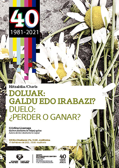 Hitzaldia Doluak: galdu edo irabazi? Data 2022/02/14 Cristina Lizarraga QLCren (Quítame la Culpa) egilea 2022ko Otsailaren 17a, 15:00 - Auditorioa
