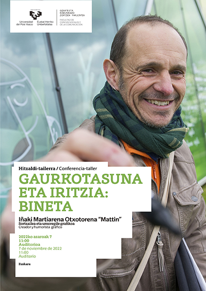 Hitzaldi-tailerra: “Gaurkotasuna eta iritzia: bineta” Data 2022/11/07, 11:00 Facebook bidez partekatu - (Beste leiho bat zabalduko du) Bluesky bidez partekatu - (Beste leiho bat zabalduko du) Linkedin bidez partekatu - (Beste leiho bat zabalduko du) Whatsapp bidez partekatu - (Beste leiho bat zabalduko du) Telegram bidez partekatu - (Beste leiho bat zabalduko du) Bidali mezu elektroniko bidez - (Beste leiho bat zabalduko du) Esteka kopiatu - (Beste leiho bat zabalduko du) Iñaki Martiarena Otxotorena “Mattin” Sortzailea eta umoregile grafikoa 2022ko azaroak 7 11:00 Auditorioa Euskara