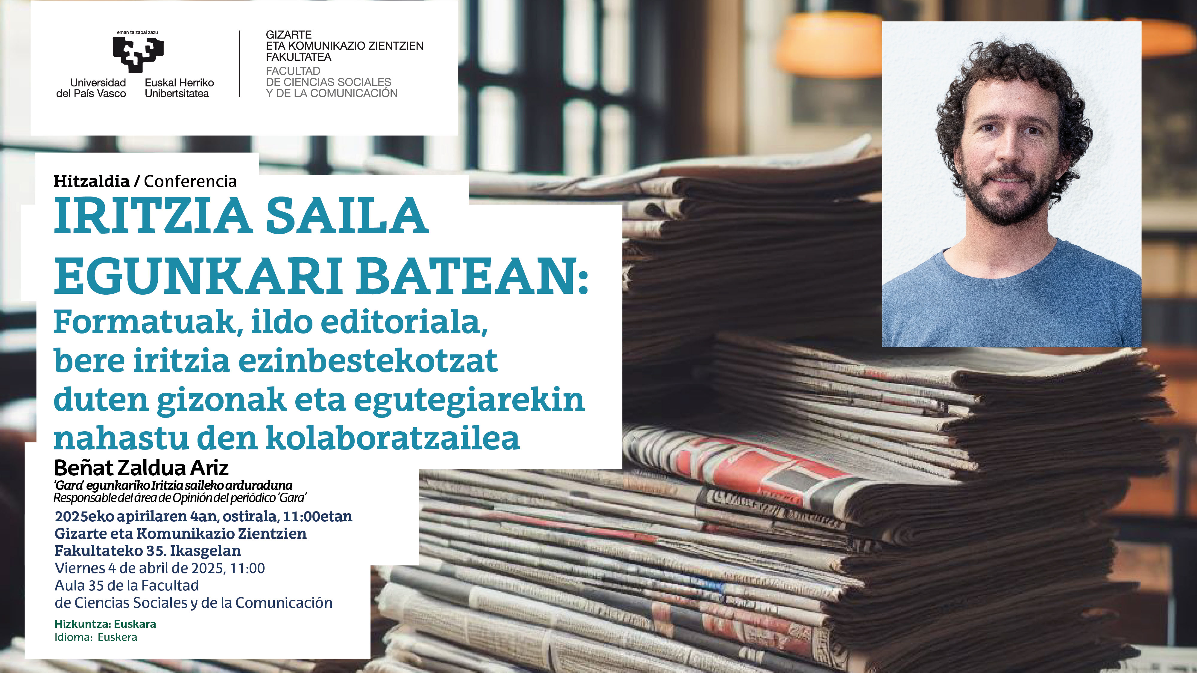 Beñat Zaldua Ariz kazetariak, Gara egunkariko Iritzia saileko arduradunak, aipatu sailaren nondik norakoak izango ditu hizpide apirilaren 4an, 11:00etan, Gizarte eta Komunikazio Zientziak fakultateko 35. ikasgelan eskainiko duen hitzaldian. Hitzaldi horretan, neurri handi batean, Gara kazetaren Iritzia sailak nola funtzionatzen duen azalduko du. Horrezaz gain, sailarekin berarekin harremandutako beste hainbat gai ere landuko ditu.