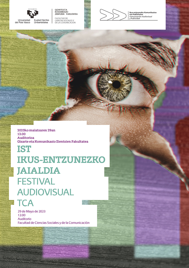 Aurten ere IST/TCA ikus-entzunezko jaialdiarekin hitzordua iritsi da. Datorren astelehenean, maiatzak 29, eguerdiko 12etan, Fakultateko Auditorioan, lehen mailako ikasleek Ikus-entzunezko Sorkuntza Teknikak ikasgaian egindako lan onenak proiektatuko dira.