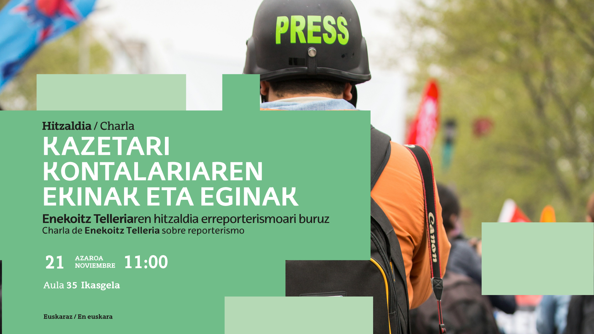 Hitzaldia Kazetari kontalariaren ekinak eta eginak Data 2025/11/21, 11:00 Facebook bidez partekatu - (Beste leiho bat zabalduko du) Bluesky bidez partekatu - (Beste leiho bat zabalduko du) Linkedin bidez partekatu - (Beste leiho bat zabalduko du) Whatsapp bidez partekatu - (Beste leiho bat zabalduko du) Telegram bidez partekatu - (Beste leiho bat zabalduko du) Bidali mezu elektroniko bidez - (Beste leiho bat zabalduko du) Esteka kopiatu - (Beste leiho bat zabalduko du) Enekoitz Telleriaren hitzaldia erreporterismoari buruz Azaroak 21, ostirala, 11:00 35. ikasgelan Komunikazio eta Gizarte Zientzien Fakultatea