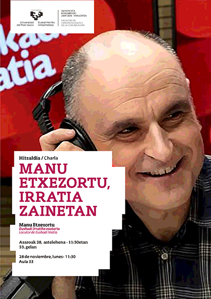 Hitzaldia Manu Etxezortu, irratia zainetan Data 2022/11/28, 11:00 Facebook bidez partekatu - (Beste leiho bat zabalduko du) Bluesky bidez partekatu - (Beste leiho bat zabalduko du) Linkedin bidez partekatu - (Beste leiho bat zabalduko du) Whatsapp bidez partekatu - (Beste leiho bat zabalduko du) Telegram bidez partekatu - (Beste leiho bat zabalduko du) Bidali mezu elektroniko bidez - (Beste leiho bat zabalduko du) Esteka kopiatu - (Beste leiho bat zabalduko du) Hizlaria: Manu Etxezortu, Euskadi Irratiko esataria Lekua (aretoa/ikasgela): 33. gela Eguna: Azaroak 28 Ordua: 11:30etan