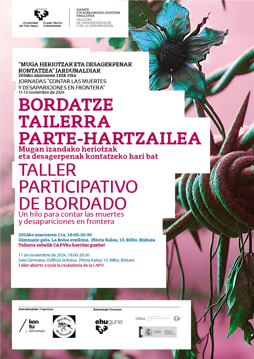 Azaroaren 11ko tailerra EAEko herritar guztiei irekitako gunea da. Tailerrera bertaratzen direnek gai honi buruzko hausnarketa eta sorkuntzarako gune batean parte hartuko dute, metaforaren eta brodatuaren praktikaren bitartez. Jarduera Ongi Etorri Errefuxiatuak eta Esperanza Jorge Barbuzano (Pablo Olavide) antropologoaren arteko lankidetzaren emaitza da, eta ez da beharrezkoa aldez aurretik brodatuarekin esperientziarik izatea.