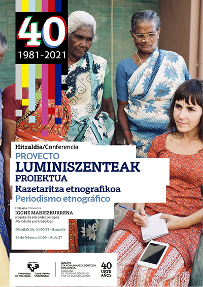 "LUMINESZENTEAK" proiektua. Kazetaritza etnografikoa Data 2022/02/24, 11:00 Emakumeen aurkako indarkeria mota desberdinak erakusten dituen proiektua. Hizlaria: Igone Mariezkurrena, Kazetaria eta antropologoa Otsailak 24, 11:00 27. Ikasgela Irudi galeria Irudia ehu.file-download(jpg, 275,74Kb) Irudia ehu.file-download(jpg, 224,64Kb) Irudia ehu.file-download(jpg, 131,67Kb)