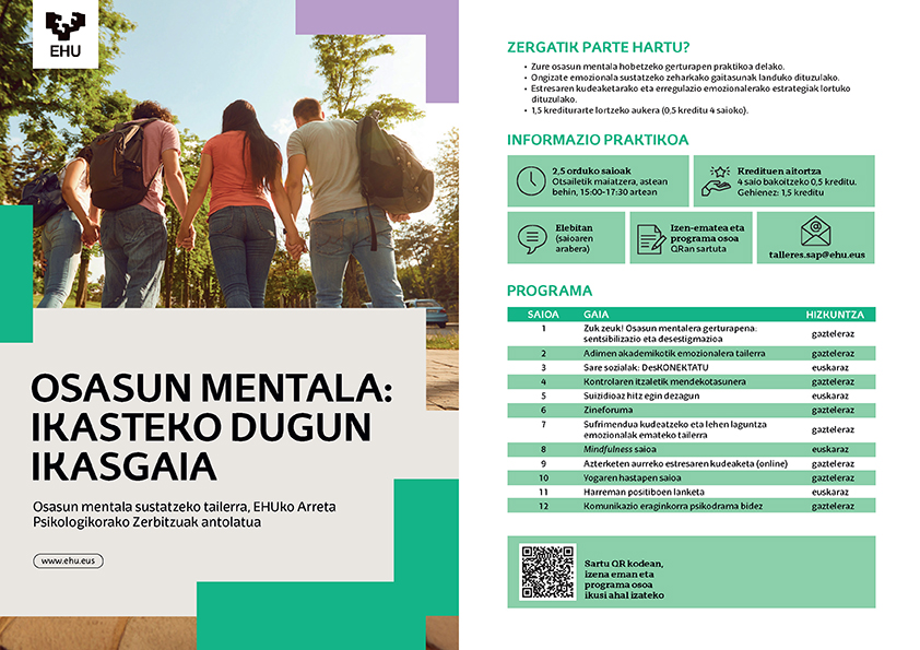 Ikasle guztiei zuzendutako proposamena da, ongizate emozionala, prebentzioa eta osasun mentalaren sentsibilizazioa sustatzera bideratua, ikuspegi praktiko eta parte-hartzailearen bidez, eta, gainera, 1,5 ECTS kreditu lortzeko aukera ematen du.