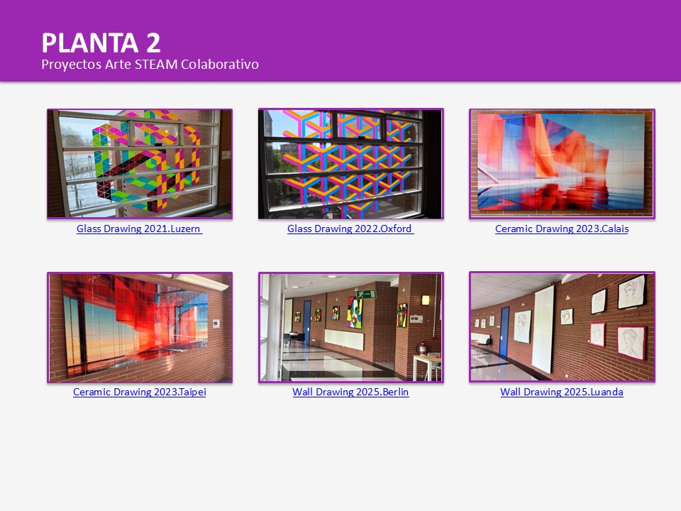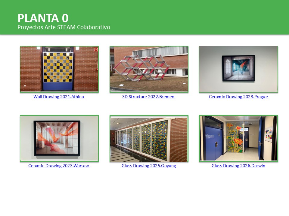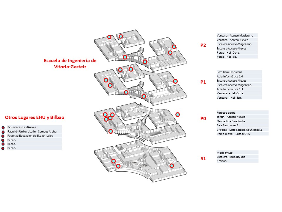 En la Escuela de Ingeniería de Vitoria-Gasteiz, las obras están distribuidas en todas las plantas del edificio: Planta 2, Planta 1, Planta 0 y Sótano 1, generando un recorrido artístico vertical que acompaña la vida académica diaria. Esta presencia integral convierte el edificio en un ecosistema creativo continuo, donde cada nivel alberga intervenciones que dialogan con su contexto espacial y funcional.