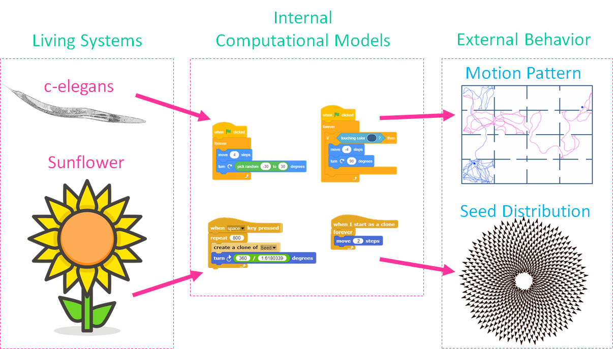 Computational system that distributes 800 seeds in a pattern the replicates natural sunflowers. The complete control includes only two scripts.
