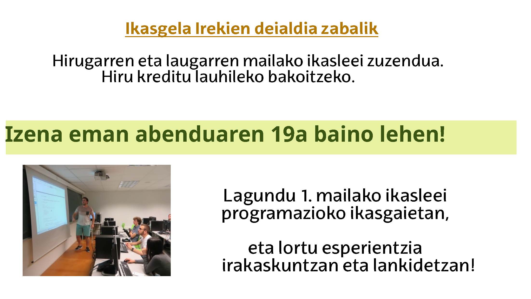 Gela irekiak: Ikasle laguntzaile gisa parte hartzeko eskaera Lehenengo argitaratze data: 2025/11/24 Facebook bidez partekatu - (Beste leiho bat zabalduko du) Bluesky bidez partekatu - (Beste leiho bat zabalduko du) Linkedin bidez partekatu - (Beste leiho bat zabalduko du) Whatsapp bidez partekatu - (Beste leiho bat zabalduko du) Telegram bidez partekatu - (Beste leiho bat zabalduko du) Bidali mezu elektroniko bidez - (Beste leiho bat zabalduko du) Esteka kopiatu - (Beste leiho bat zabalduko du) Informazio gehiago: Deialdia