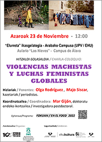 El miércoles 23 de noviembre, a las 12 horas, en el Salón de Actos del Aulario Las Nieves (Campus de Álava - UPV/EHU) tendrá lugar la CHARLA-COLOQUIO VIOLENCIAS MACHISTAS Y LUCHAS FEMINISTAS GLOBALES con la intervención como ponentes de Olga Rodríguez, periodista especializada en información internacional y derechos humanos, y Majo Siscar, periodista especializada en Europa, América Latina y derechos humanos, coordinadas por la compañera del Valentín de Foronda e investigadora postdoctoral Juan de la Cierva - Incorporació, Mar Gijón Mendigutía.