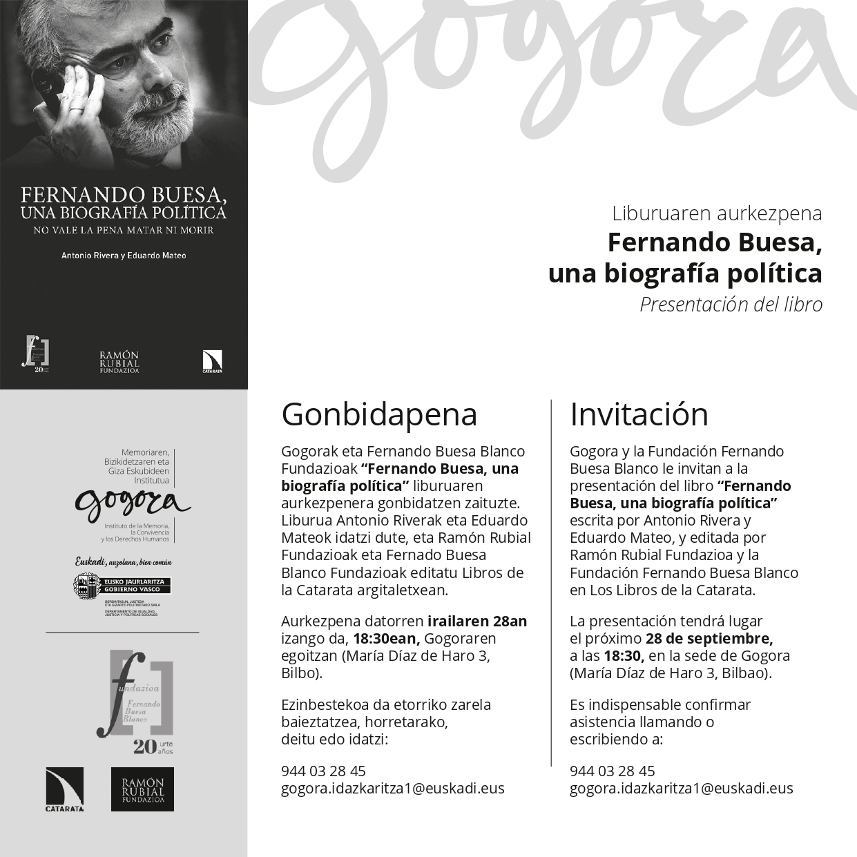 Gogorak eta Fernando Buesa Blanco Fundazioak "Fernando Buesa, una biografía política" liburuaren aurkezpena gonbidatzen zaituzte. Liburua Antonio Riverak eta Eduardo Mateok idatzi dute, eta Ramón Rubial Fundazioak eta Fernando Buesa Blanco Fundazioak editatu Libros de la Catarata argitaletxean.