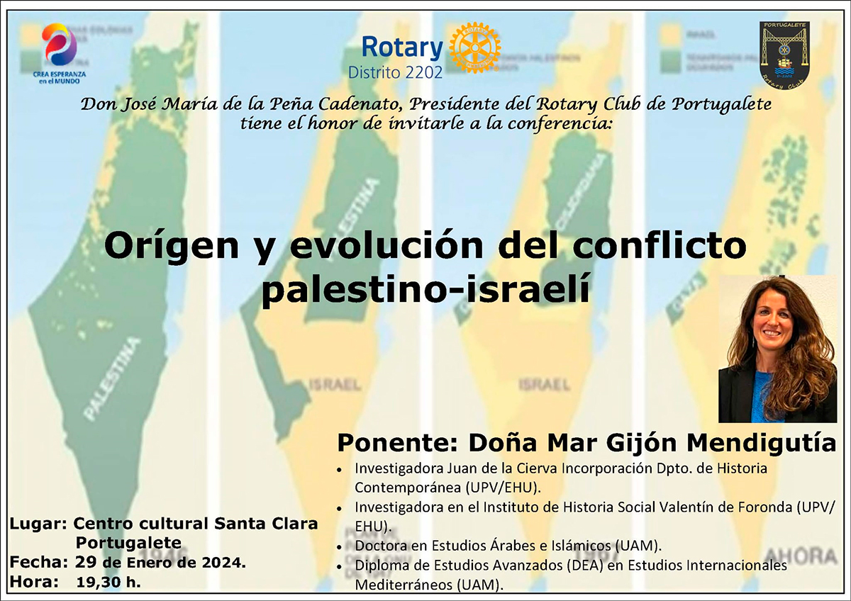 José María de la Peña Cadenato jaunak, Portugaleteko Rotary Clubeko lehendakariak, hitzaldira gonbidatzeko ohorea du: "Origen y evolución del conflicto palestino-israelí"