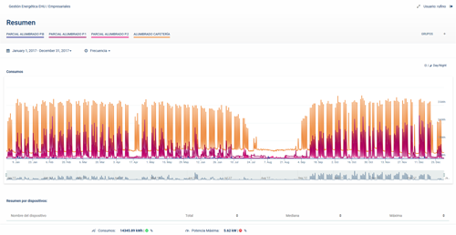 Monitorizatutako lau zirkuituetan hartutako neurriak analizatu ziren, horrela, kontsumoen eta eskarien urteko bilakaera eta asteko kontsumoak ohiko irakaskuntza dagoen aste batean duen bilakaera aztertzeko. Jarraian ikus daiteke monitorizatutako lau zirkuituen urteko kontsumoari dagokion grafikoa. Bertan ikus daiteke kafetegiko zirkuituak kontsumo handia duela.