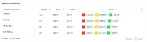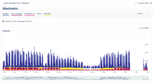 Monitorizatutako lau zirkuituetan hartutako neurriak analizatu ziren, horrela, kontsumoen eta eskarien urteko bilakaera eta asteko kontsumoak ohiko irakaskuntza dagoen aste batean duen bilakaera aztertzeko. Jarraian ikus daiteke monitorizatutako bost zirkuituen urteko kontsumoari dagokion grafikoa. Maximetro baten bidez neurtu ziren, eta bertan ikus daiteke galdara gelako eta kafetegiko zirkuituek kontsumo handia dutela.
