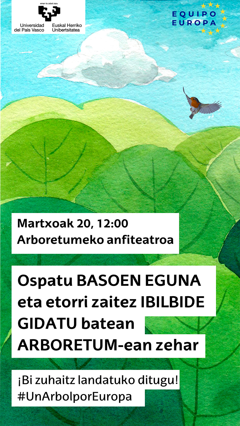 UPV/EHUk bat egiten du #UnArbolporEuropa kanpainarekin, tokiko iraunkortasunarekin eta Europako baso-soiltzearen aurkako borrokarekin duen konpromisoaren sinbolo gisa, eta Arboretumetik ibilbide bat egitera gonbidatzen zaitu, Basoen Eguna ospatzeko.