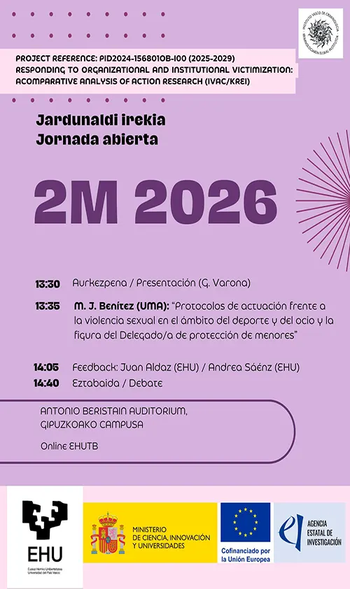 - 13:35 M.J. Benítez (UMA): "Kirolaren eta aisialdiaren eremuan sexu-indarkeriaren aurrean jarduteko protokoloak eta adingabeak babesteko ordezkaria"