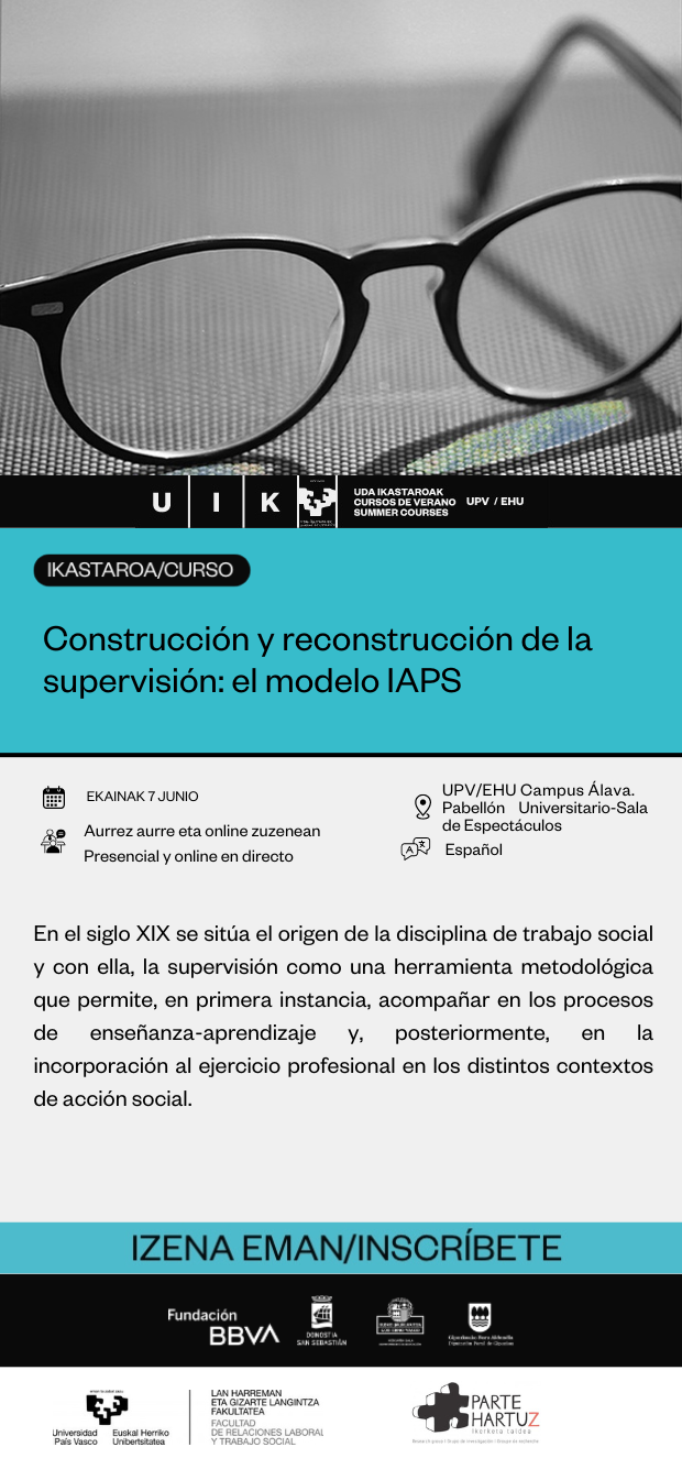 Atsegin handiz jakinarazten dizuegu Gainbegiratzearen eraikuntza eta berreraikuntza: IAPS eredua izeneko Udako Ikastaroari buruz, Euskal Herriko Unibertsitateak (UPV/EHU) bere 43. edizioan antolatutakoa. Ikastaroaren helburua da gainbegiratzera hurbilketa bat egitea eta IAPS gainbegiratze-ereduak markatutako mugarri desberdinak ezagutaraztea.