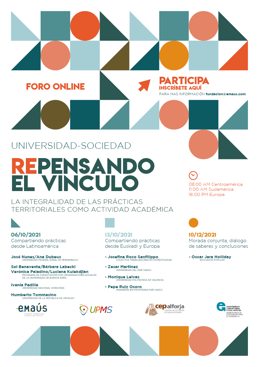 Unibertsitateak gizarte-eraldaketan zeregin erabakigarria izan dezakeela jakinik, Emaús Gizarte Fundazioan eragile akademiko eta sozialekin batera lan egiten dugu, inguratzen duen inguruneari lotutako Unibertsitate eraldatzailea sustatzeko. Ezagutza horretan funtsezkoa izan da lankidetzan aritzea Hezkuntza Herrikoian eta Hegoaldeko Epistemologietan erreferentea den CEP Alforja-rekin eta online foro hau aurkezten dugu beraiekin batera.