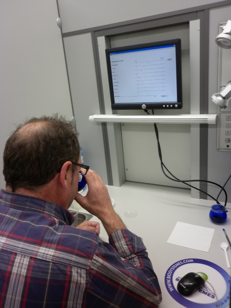 Olioaren itxuraren ebaluazioa zentzumenen bidezko ebaluaziorako gelaren kabinan -