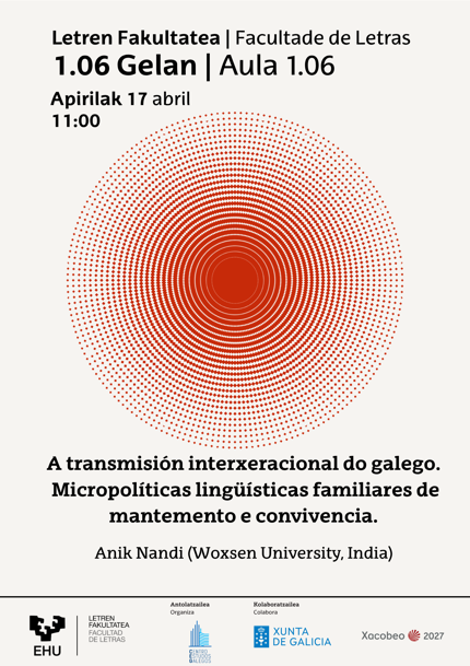 Apirilaren 17an, Anik Nandi soziolinguista eta ikertzaile bengalarrak hitzaldia emango du 1.06 gelan Letren Fakultatean, goizeko 11:00etan. Honako hau da hitzaldiaren izenburua: “A transmisión interxeracional do galego. Micropolíticas lingüísticas familiares de mantemento e convivencia”. Hona hemen hitzaldiaren ildo nagusien laburpena: