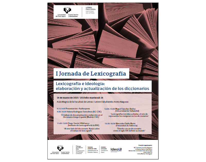 I. Lexikografia Jardunaldia 2025eko martxoaren 26an ospatuko da Letren Fakultateko Areto Nagusian. Ikasleei eta espezialistei zuzenduta, lexikografiaren eta ideologiaren arteko harremana, teknologiaren eragina eta genero-ikuspegia aztertuko dira hiztegiak egin eta garatzeko orduan. Erakunde ezberdinetako lau adituek hartuko dute parte.